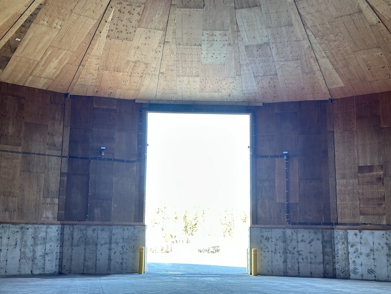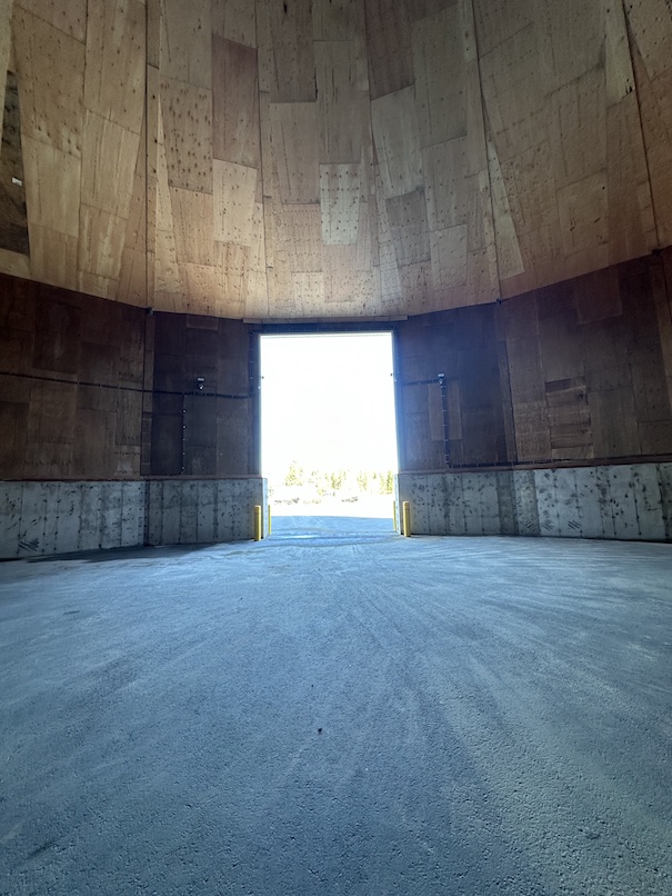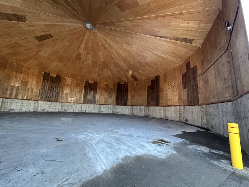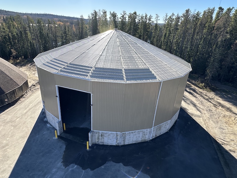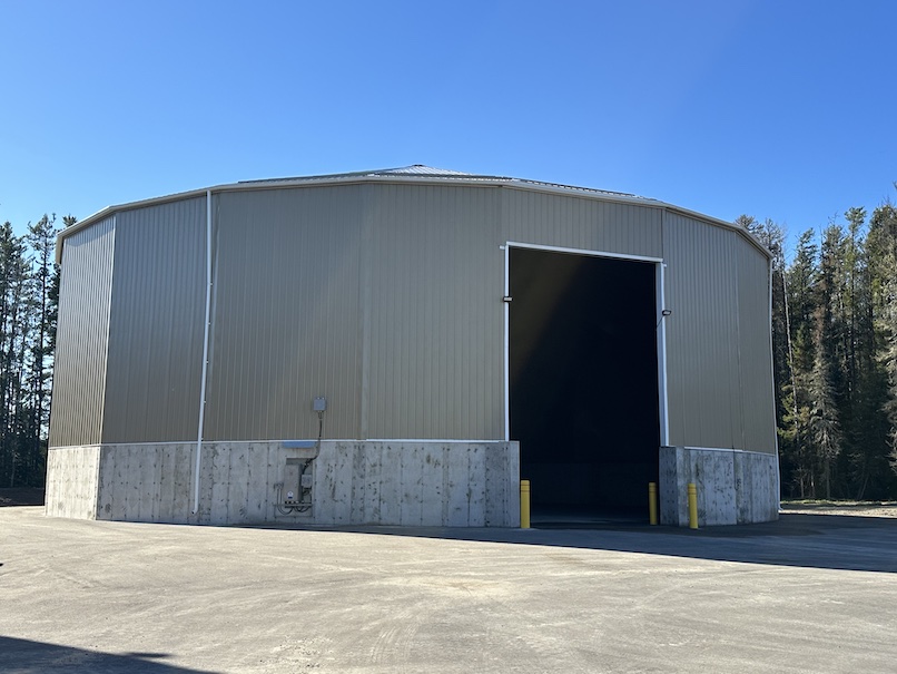 This steel framed silo is located in Beardmore, ON and is 150 ft in diameter, with a concrete foundations height of 8 ft. All steel components are hot-dip galvanized, interior walls are finished with ½” P.T. plywood, ceiling is finished with ½” plywood, outside is finished with steel cladding, soffit/fascia and eavestrough. Entrance size is 18 ft wide by 28 ft high.
